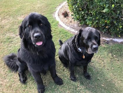 Meet Shadow and Leo. These big boys are always around the yard on North Brockfield. They have an electronic fence so they don't go past the sidewalk. Leo the Lion (the Newfoundland) is still a youngin' and very energetic. He will chase trucks, golf carts, etc. when they pass by the front yard. He goes from one side of the yard to the other. Don't be afraid. He is a gentle giant! Shadow (the black lab) is an adult dog and much calmer. They both love people and dogs. They want attention if you are willing to get slimed!!